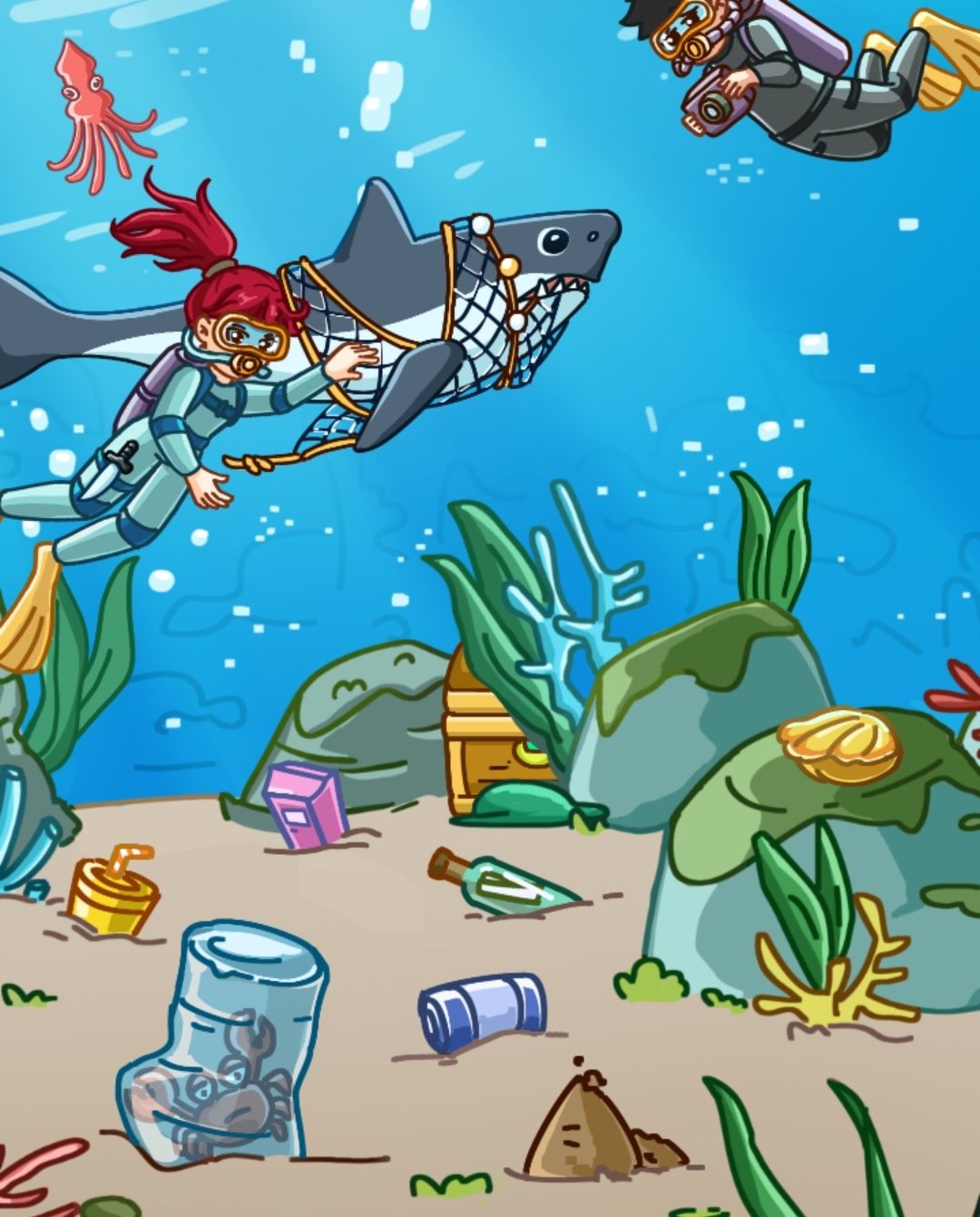 工具箱有剪刀,剪刀剪断海草和捕鱼网