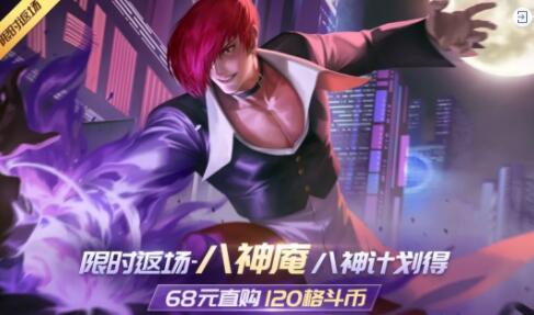 8月19日-9月9日期间,SNK正版授权英雄八神庵限时返场!活动期间可通过直购格斗币进行八神抽奖获得八神碎片,兑换八神庵英雄及八神庵头像等专属外显。