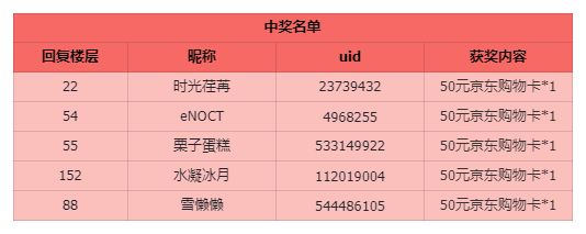 恭喜以上中奖的“卡友”,请中奖卡友于12月16日前回关发帖账号,我们将以私信的形式发放京东卡,逾期将视为放弃。