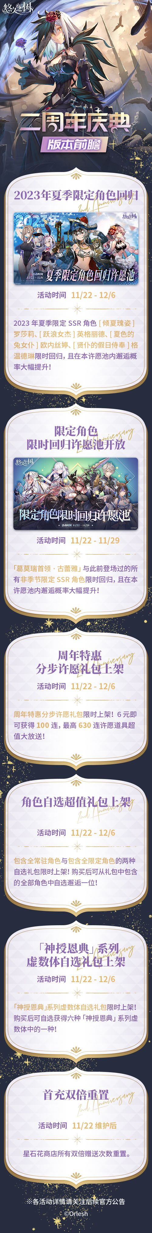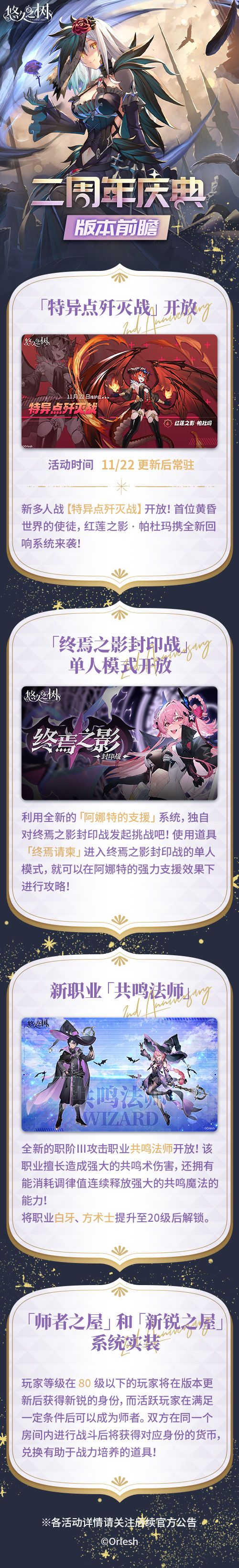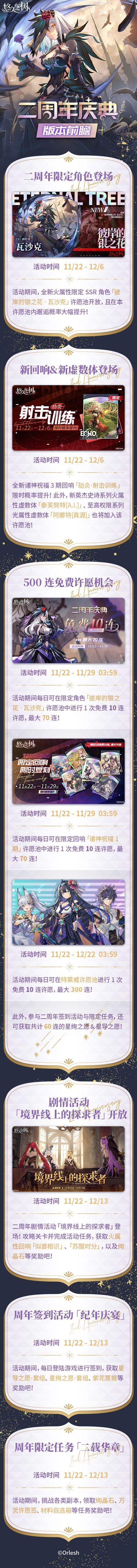 二周年版本将于11月22日上线,在此为各位探求者大人奉上二周年版本前瞻!累计500抽免费送,更有米娅、盈缺、阿娜特等伙伴准备的神秘礼物相赠!更多精彩内容,让我们一睹为快吧! ※各活动详情请参阅后续官方公告。