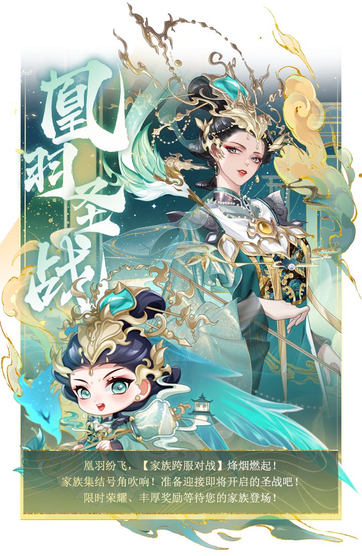 1、家族试炼中新增“凰羽圣战”家族跨服战挑战入口,参与圣战的家族在跨服期间匹配对手,击败对手后对该家族的圣兽进行挑战,每次挑战后可获得积分,活动积分会进入排行,活动展示期时可根据积分排行分别获取个人与家族奖励