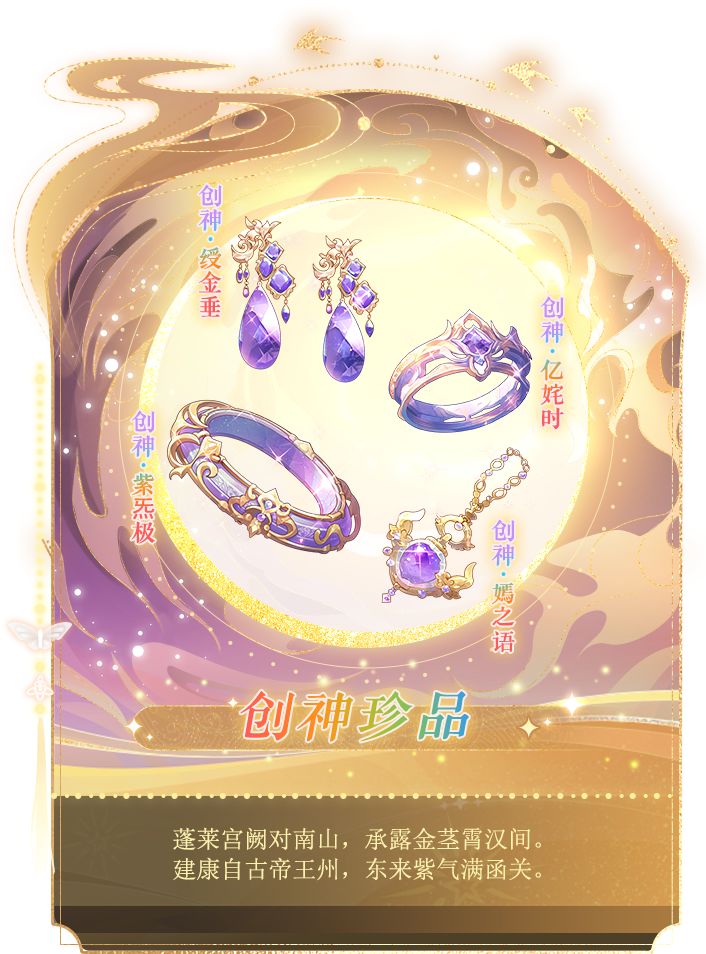1、新增手镯珍品【创神·紫炁极】、戒指珍品【创神·亿姹时】、项链珍品【创神·嫣之语】、耳环珍品【创神·绶金垂】,每个创神部件珍品需要消耗9种相同部件的红色珍品(且所选的9种珍品须达到满级、满星、满天赋升星、满神珍钢印等级、满精炼等级)与创神珍品对应的图纸和银币才可融合