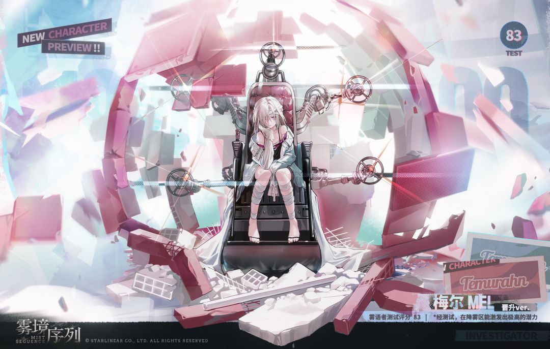 根据梭罗公司提供的档案,梅尔是梭罗公司“特殊人才培养计划”中的一员。她的身体相较常人而言极为脆弱,稍重的碰撞可能就会对她造成骨折级别的伤害。在这宛如玻璃器皿般的身体中存放着的,却是非常坚强的心智和聪明的头脑。面对先天的缺陷,梅尔并没有绝望,反而选择积极地生活下去,这也是她来到调查团的原因之一。
