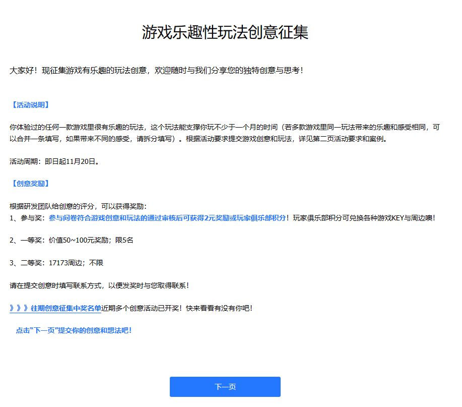 1.游戏乐趣性玩法创意征集https://wj.qq.com/s2/13494451/c787
