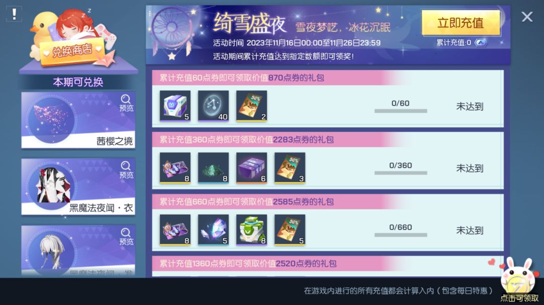 本次更新之后,累计充值福利再度开启!累计充值点券达到一定数额即可获得超值返利!除此之外,还可以获得琉璃月华礼券,兑换环影·茜樱之境、时装·黑魔法夜闻、头发·黑魔法夜闻、头饰·黑魔法夜闻、头像·甜心派对、头像·美味欢礼、主题朋友圈装饰、梦幻兑换券等超值奖励!(充值从0点开始计算,活动界面开放时间以实际时间为准。) 符咒限时礼包上架本次更新之后,商业街-商区-促销区中将上架符咒系列限时礼包,购买系列礼包可获得海量钻石、符咒限定招募券—异华秘卷、调合流茧、诫律钼石道具等珍稀奖励哦! 新龙纹开放,龙纹礼包限时降临听说第八枚龙纹:御水即将开放啦!从11月20日起,在商业街-商区-促销区中将上架龙纹系列限时礼包,购买系列礼包可获得海量钻石、龙之茧、龙纹培养材料等珍稀奖励,超高返利,不要错过! 其他修复调整在本次更新中,我们还修复调整了以下问题:修复了198级主线个别任务无法完成的问题;修复了“团圆元宵”活动结束后,个别任务未正常消失问题;修复了白帝神宫内积分排名界面与限时回馈活动显示冲突的问题;调整了跨服爆破匹配结果的显示,在比赛正式开始前,将不再显示对手队伍信息;调整了极道巅峰副本入场NPC的坐标,现在入场时将不再会受到玩家的恶意干扰。 本期情报就是这些啦!希望各位同学在卡塞尔学院中愉快度过本周~在校园里遇到任何困难,欢迎随时向EVA求助哦~