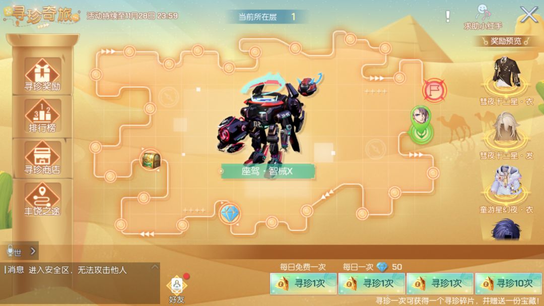本次更新之后,全新寻珍奇旅活动将震撼启动,同学们赶快踏上丰饶之途,一起寻找失落的秘宝吧!参与寻珍奇旅可以获得座驾·智械X、时装·彗夜十二星·衣、发型·彗夜十二星·发、头饰·彗夜十二星·头饰、返场时装·童游星幻夜·衣、返场发型·童游星幻夜·发、返场头饰·童游星幻夜·头饰、手办·源稚女-暮歌、聊天气泡·桃喵天使、聊天背景·兔咪甜心、头像·感心之宴、项链·珠宴等奖励!探索时有概率获得双倍暴击奖励,更有座驾、时装等道具必定双倍的神秘事件等你解锁。每次探索可以前进一定的步数,不断前进可以获得奇遇珍宝,更有概率直接获得座驾、时装等大奖。探索达到指定次数还可以获得星驰航宇礼券和星驰航宇奖章,兑换动态头像框、背饰、面饰、头像框、纹身、纹面、头像等超值奖励!同时,我们在商区-促销区-寻珍商店中上架了高级半价卡礼包、精致半价卡礼包、超值半价卡礼包,根据在寻珍奇旅中的寻珍次数还可解锁购买寻珍奇旅茧化礼包、寻珍奇旅特权礼包,可获得超值龙之茧养成材料、龙纹养成材料和寻珍之引,本期特权礼包中额外加入了大量寻珍秘宝,欢迎同学们选购!更新后,同学们参与寻珍奇旅活动有机会触发最高价值900%+超值限时礼包,趁着限时触发礼包折扣大幅提升的机会,大家赶快参与起来吧! 累充福利限时开启