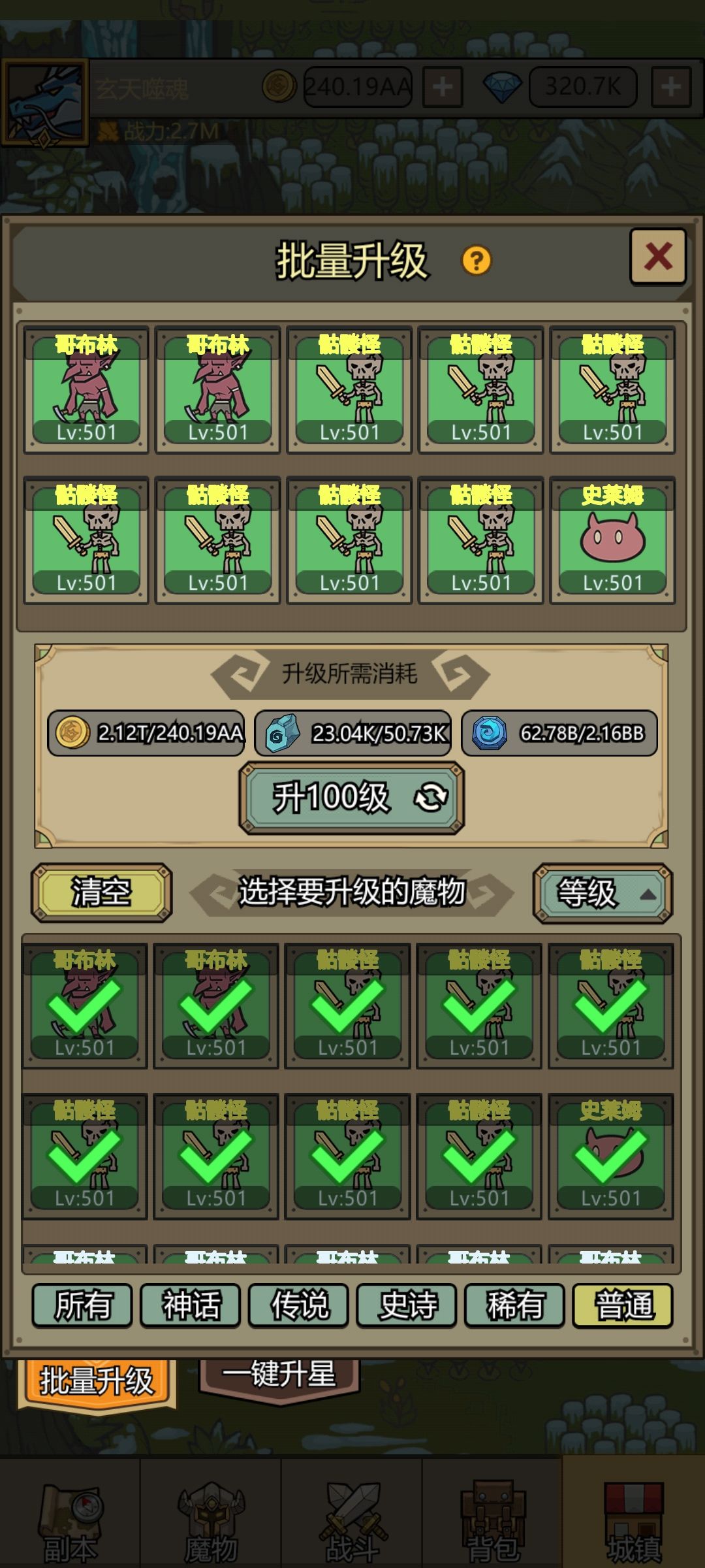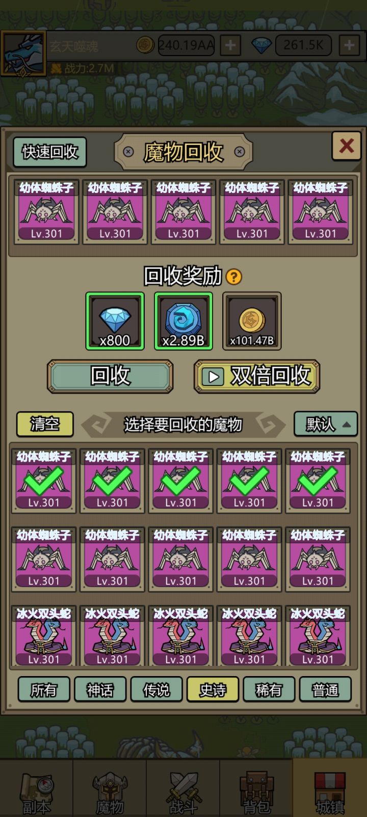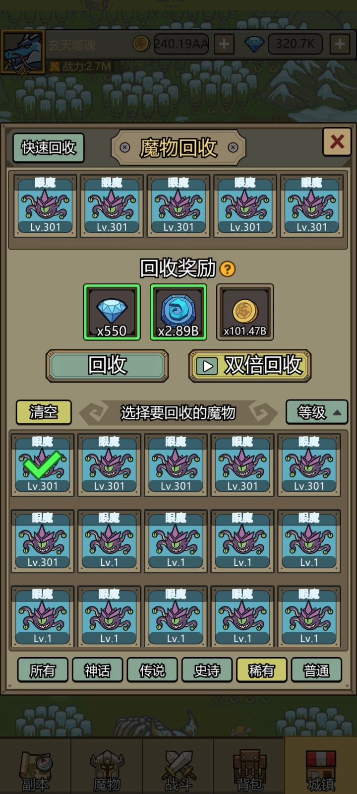 回收,回收刷钻的方法大家都知道就不多说。在这我建议除非层数特别高了,变异的也就升到301就够了,因为升600那一下特别花升阶石,具体看图。但是卖的话确并不能多多少钻,收益奇低。回收双倍每次广告多得的钻石看图,传说神话没算,(不会真有人这么富吧?)总结下就是,每次广告回收多得的钻石收益,绿色475,蓝色550,紫色800。