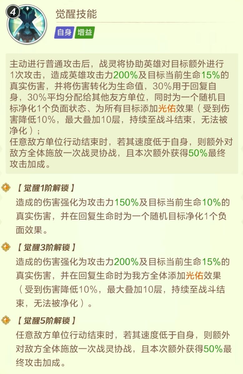 5星效果尤为强大的(类似于屏反),当全场1速达到收益最大化攻击5次,当对手速度慢的行动后,战灵攻击群体1次,不但群体输出拉满,同时能够回血、净化、还可以叠加减伤buff,使得第一回合就可以叠满100%减伤。