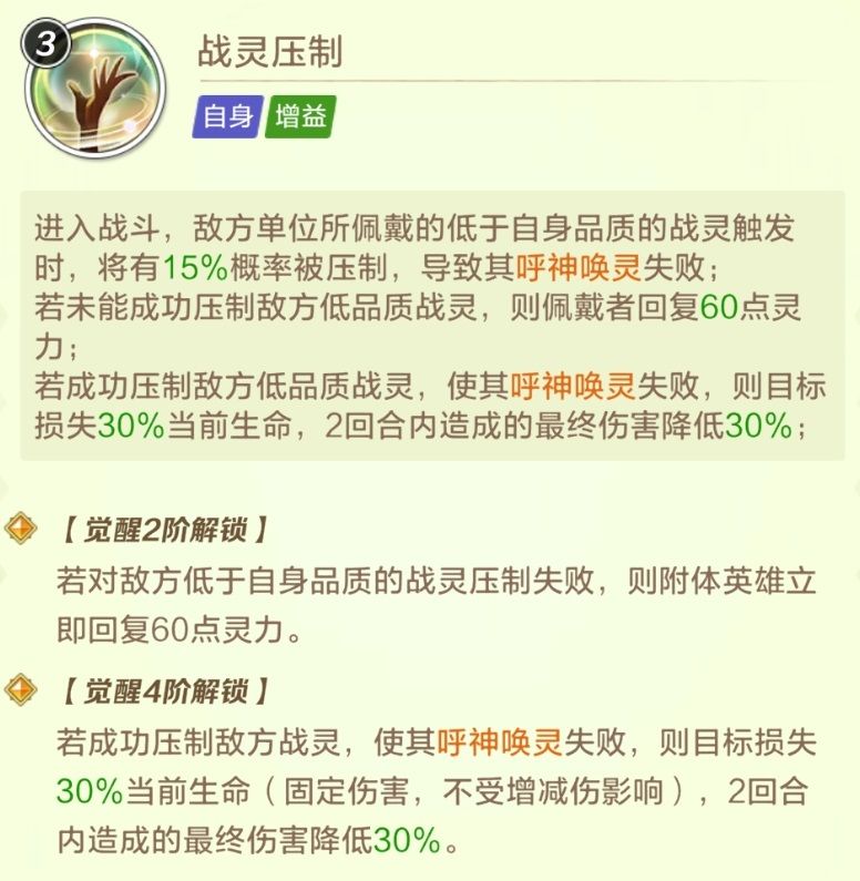 15%概率使对方战灵触发失败,非常强大的效果。觉醒战灵越多,压制次数也就越多,特别是面对3星卫莺,一旦成功压制基本上可以赢下对战了。