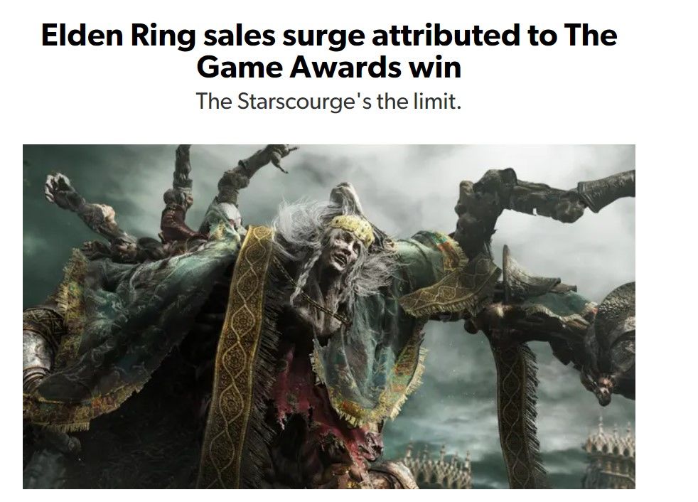 在颁奖还没开始之前,TGA官方账号曾经发布了一个帖子来让玩家们来猜测一下今年的年度游戏,有玩家将《战神:诸神的黄昏》与《艾尔登法环》之间的较量叫做“The battle of the giants”(巨人之战)。在评论区则如常开启了辩论赛。一派支持《战神:诸神的黄昏》,一派支持《艾尔登法环》,还有人认为其他游戏也有资格一战。在评论中,一名用户说出了一个中肯的评论:“年度游戏肯定是在它们中产生,但是谁赢根本不重要。因为无论如何,这次提名都会给这两个游戏带来充足的曝光度...” 实际上正是如此,国外有媒体指出,在TGA上获奖之后,《艾尔登法环》的销量在年底激增。