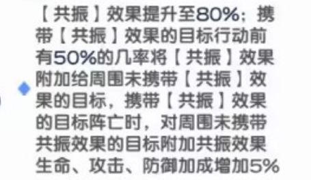 共振的效果提升至60%/80%攻击力;携带共振效果的目标行动前有50%的几率附加给周围未携带共振效果的目标,携带共振效果的目标阵亡时,对周围未携带共振效果的目标附加共振效果