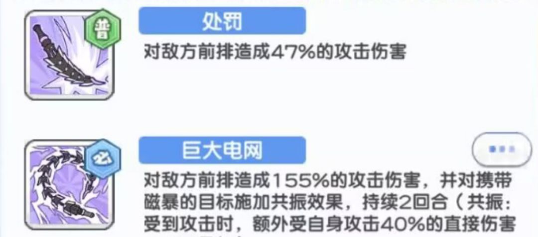 技 能——巨大电网:对敌方前排造成155%的攻击伤害,并对携带磁暴的目标施加共振效果,持续2回合(共振:受到攻击时,额外受自身攻击40%(携带共振的目标)的直接伤害,不可叠加)