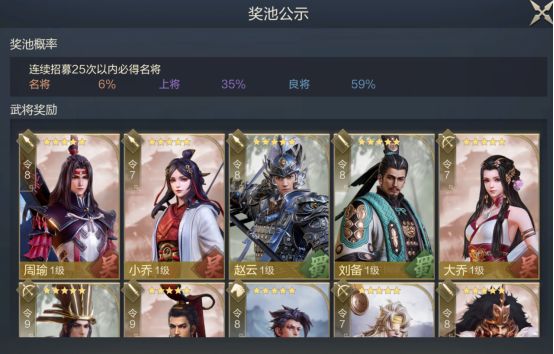 另外一点就是抽卡的爆率,毕竟要组起战斗力充足的队还是有必不可少的几张卡的,鸿图之下目前五星的出率是6%,25次之内必出,几率还是挺高的,前期有五星开荒会好打很多,要是有吕布这种面板武力最高的,更能省不少力,凑得齐带羁绊加成的吴国猛虎一脉(孙权孙策孙坚)或是桃园队(刘关张)这些队伍,在后期也可以稳定输出。