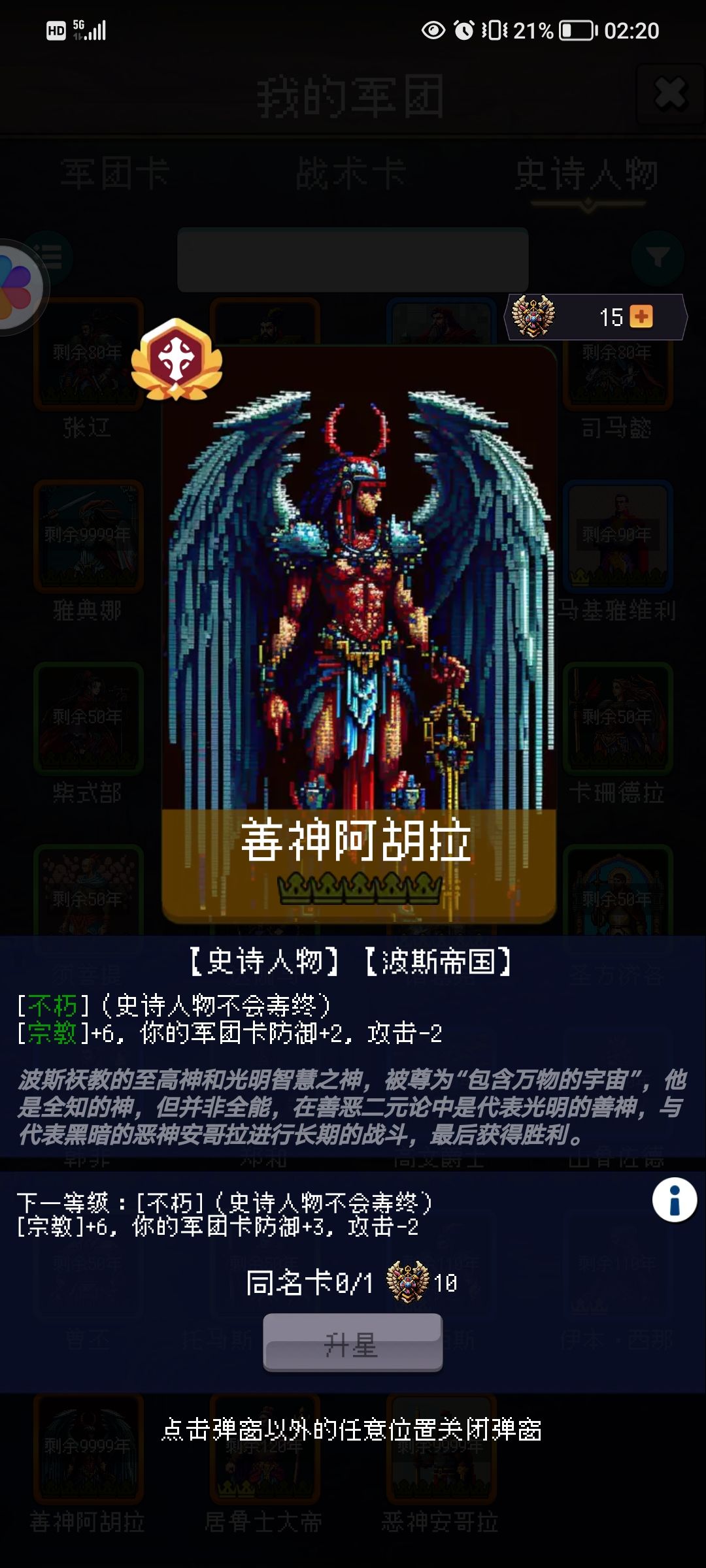 波斯战象:器械 攻城伤害。主动100% 冷却3,对敌方全体造成自己血量上限的30—50%伤害,自身血量上限+10点,限10层