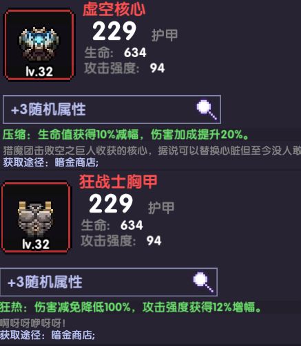 胸甲虚空核心和狂战士胸甲都行,因为深谙套没提供啥攻强,因此攻强衣服更适合,大秘境容易被秒就带虚空核心