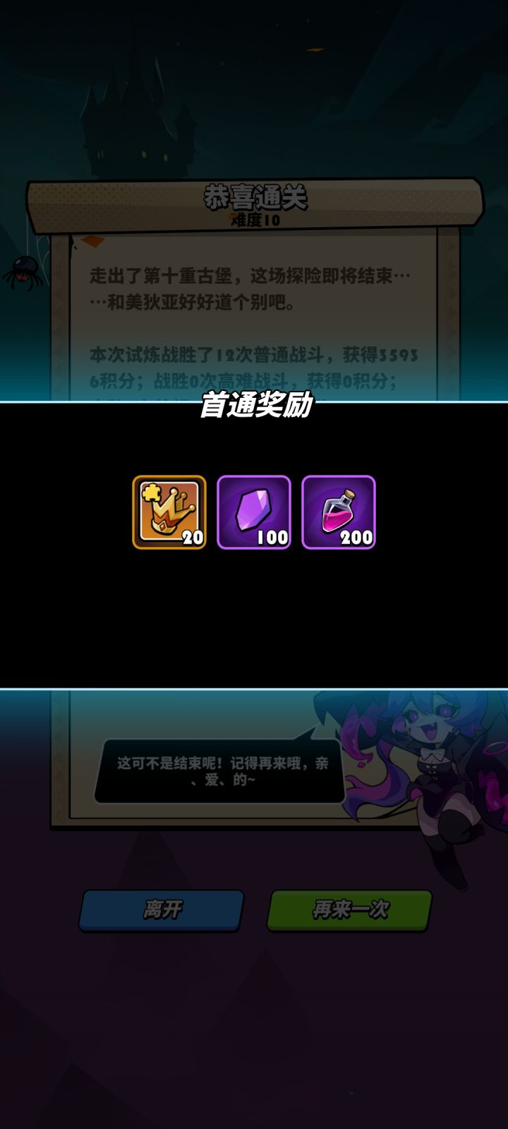 全程一共用了5个复活药,第一层一个,二层一个,三层前面小怪一个,三层boss用了俩,加送的一次次数的三星美狄亚打过了,这波打的比较幸运,一层boss前选到了美狄亚加一星的buff,然后拿到了二级旋转球加二级毒,二层中期拿到了三级旋转球加毒,boss前拿到一个受击加生命,不过分数比较低,8w9,用的2星美狄亚,材料全是活动白嫖的,如果没有2星或以上的美狄亚还是别打了,打不了一点,另外我感觉这个活动的机制除了专门为美狄亚量身设计打造的之外,还有就是为了限制敖霜的输出的,因为只能吃到星级和连携的加成,装备锻造啥的都吃不到,敖霜除了攻击暴击还需要攻速,升级buff中并没有,所以在活动图的环境里和美狄亚比不了一点,我三星的敖霜进去打的伤害大约等于美狄亚的五分之一,所以老老实实美狄亚吧。