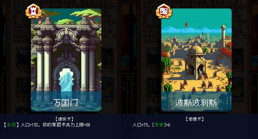 【奇观】果然增加的是兵力上限,对应了特殊的兵力百分伤害;【波斯波利斯】是【征服波斯】所需要的【地理卡】~~~