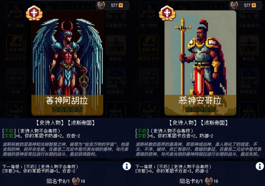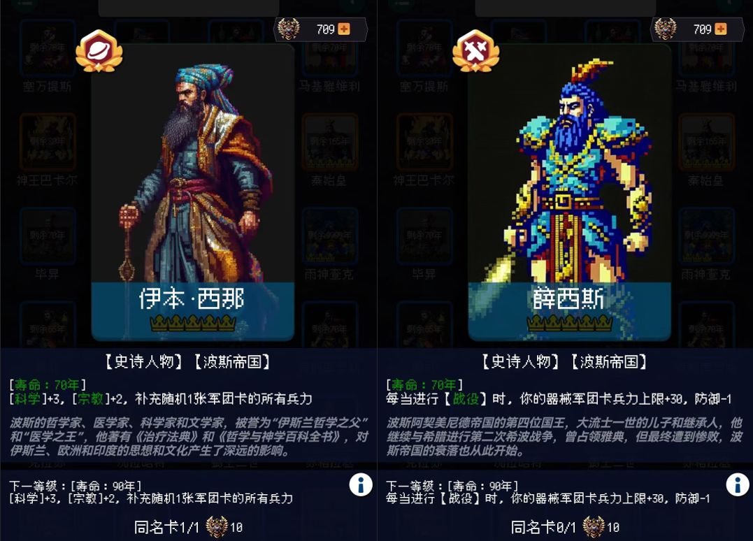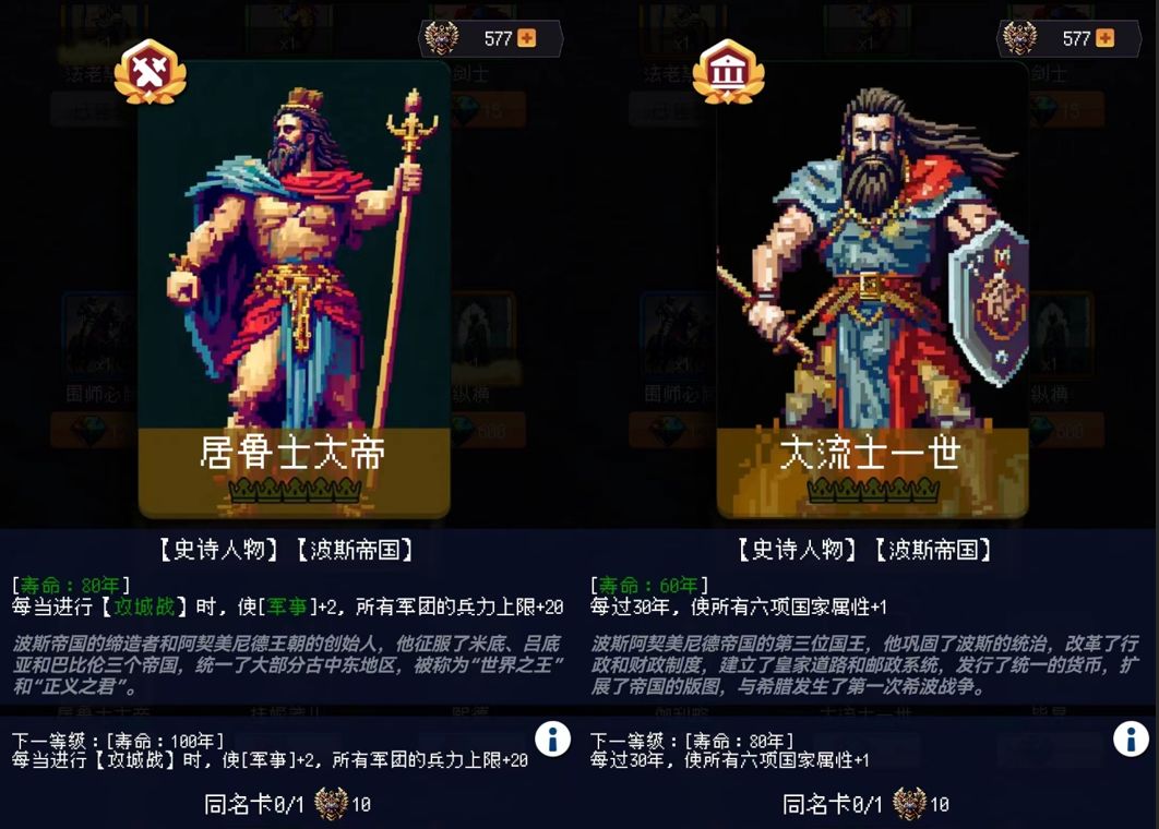 其中:【居鲁士大帝】可以在游戏内获得永久卡。300年后,【征服波斯帝国】,需要军事85以及地理卡【波斯波利斯】。