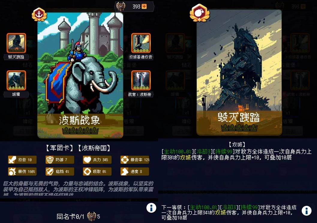 【波斯战象】贸yi站可获得,第一次出现的兵力百分比伤害,345兵力的30%可以造成103.5点伤害,如果只看攻击,哪怕是【角斗士】的濒死大招,也只能造成600%,也就是60点伤害。