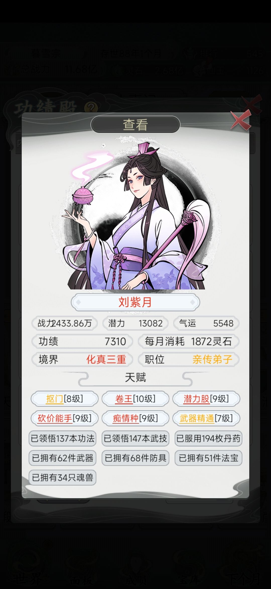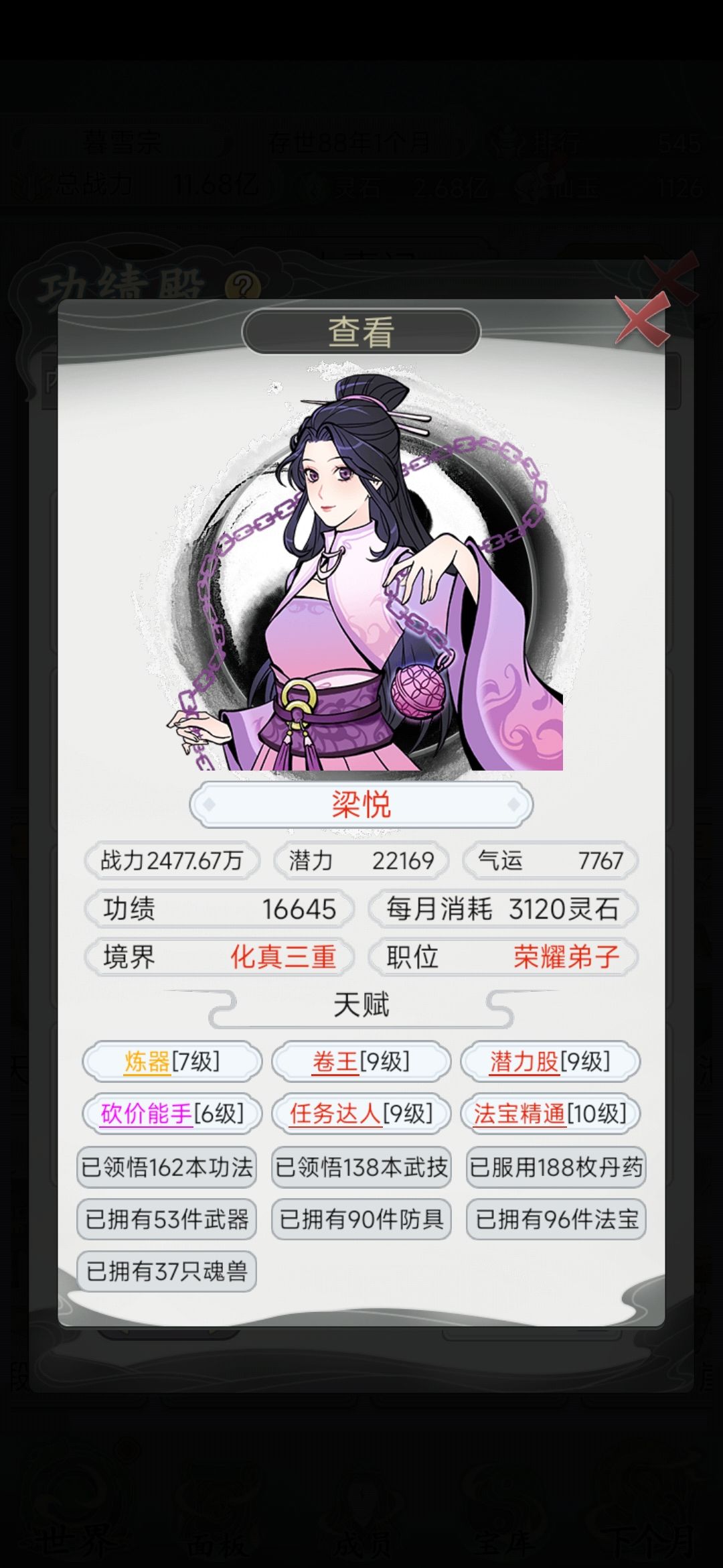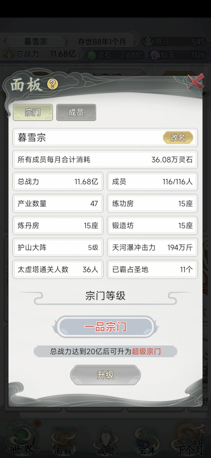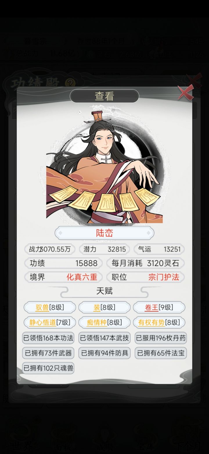 佛系玩家 一品宗门 玩到70几年的时候晋升的吧 弟子天赋一般 不想刷那么长时间差不多就培养了 也不是培养一个人 是这几个都在培养 资源也不是用在一个人身上的 下面说说我对这个游戏的理解