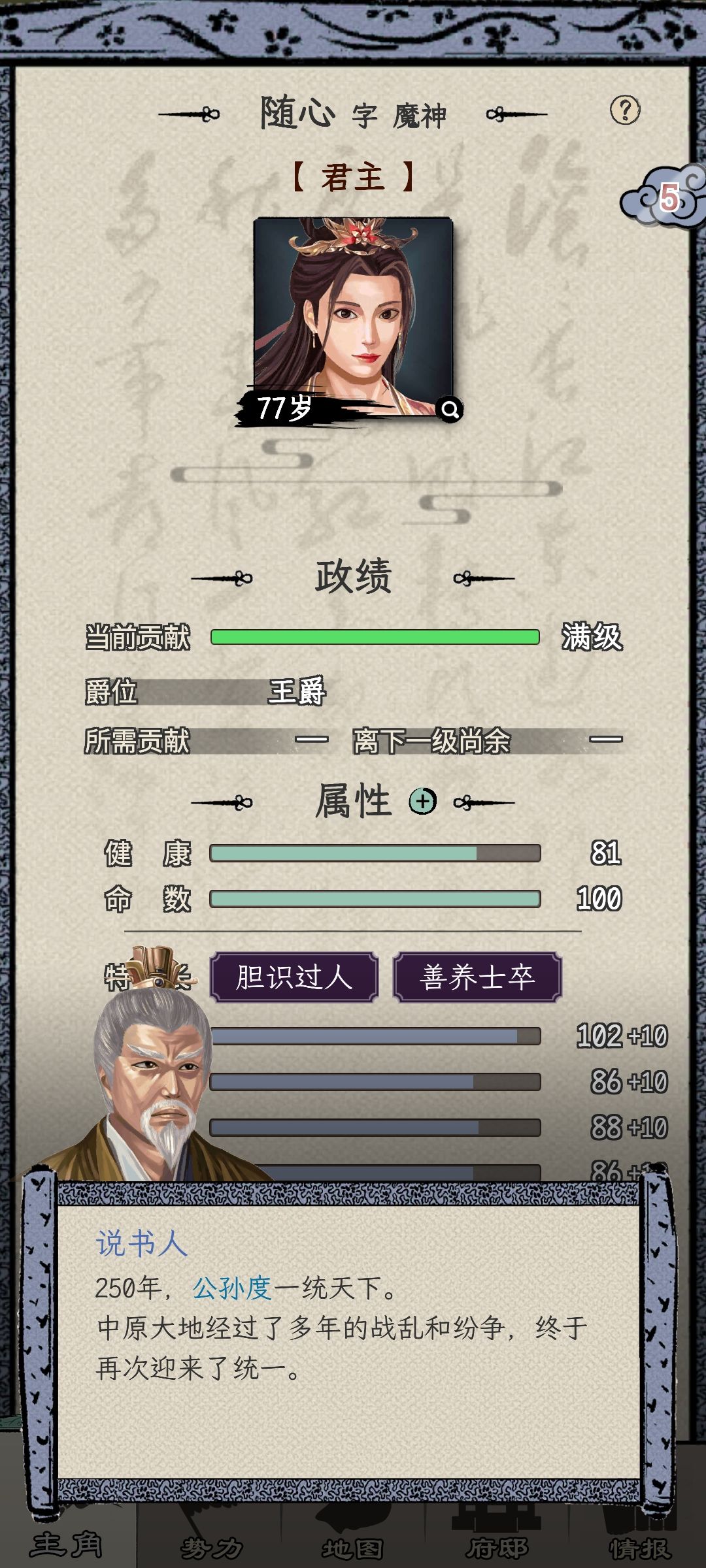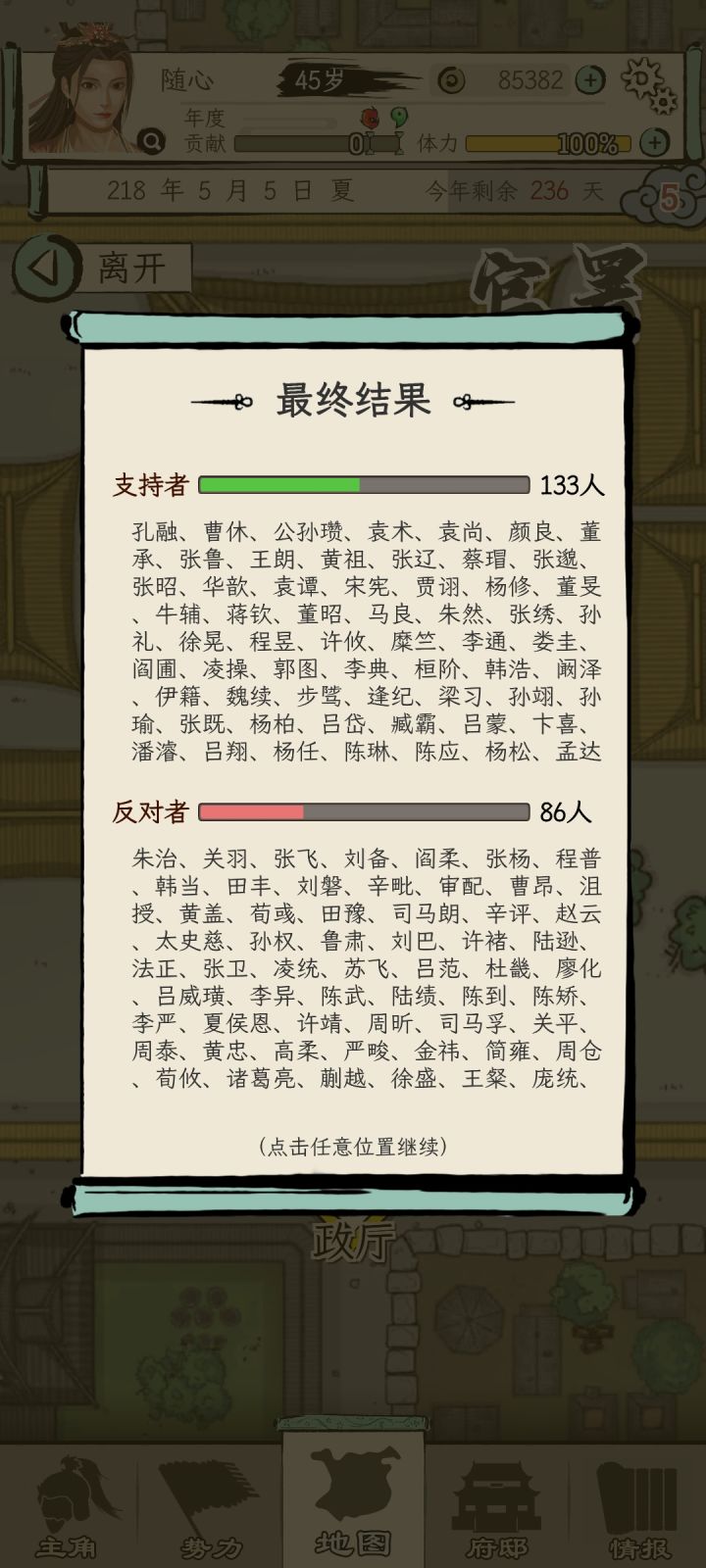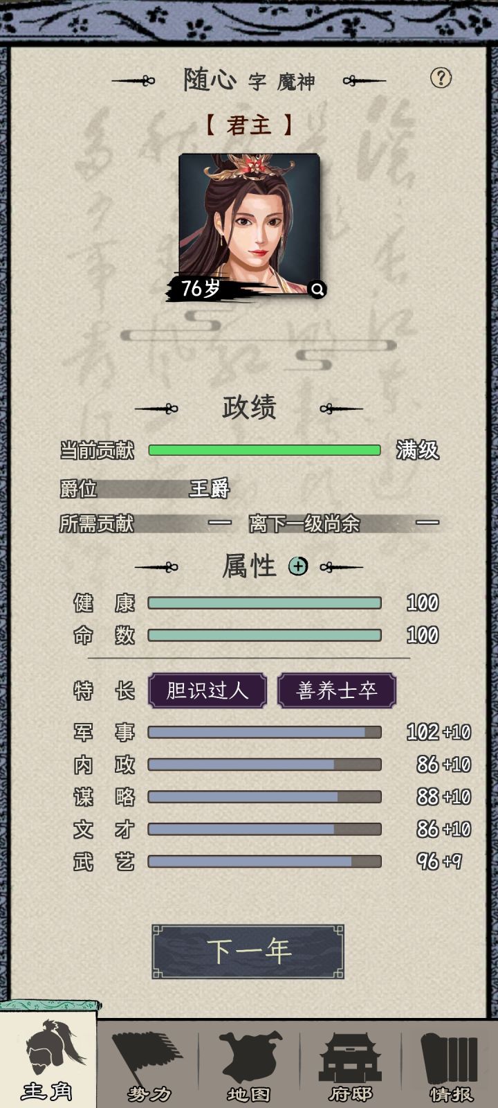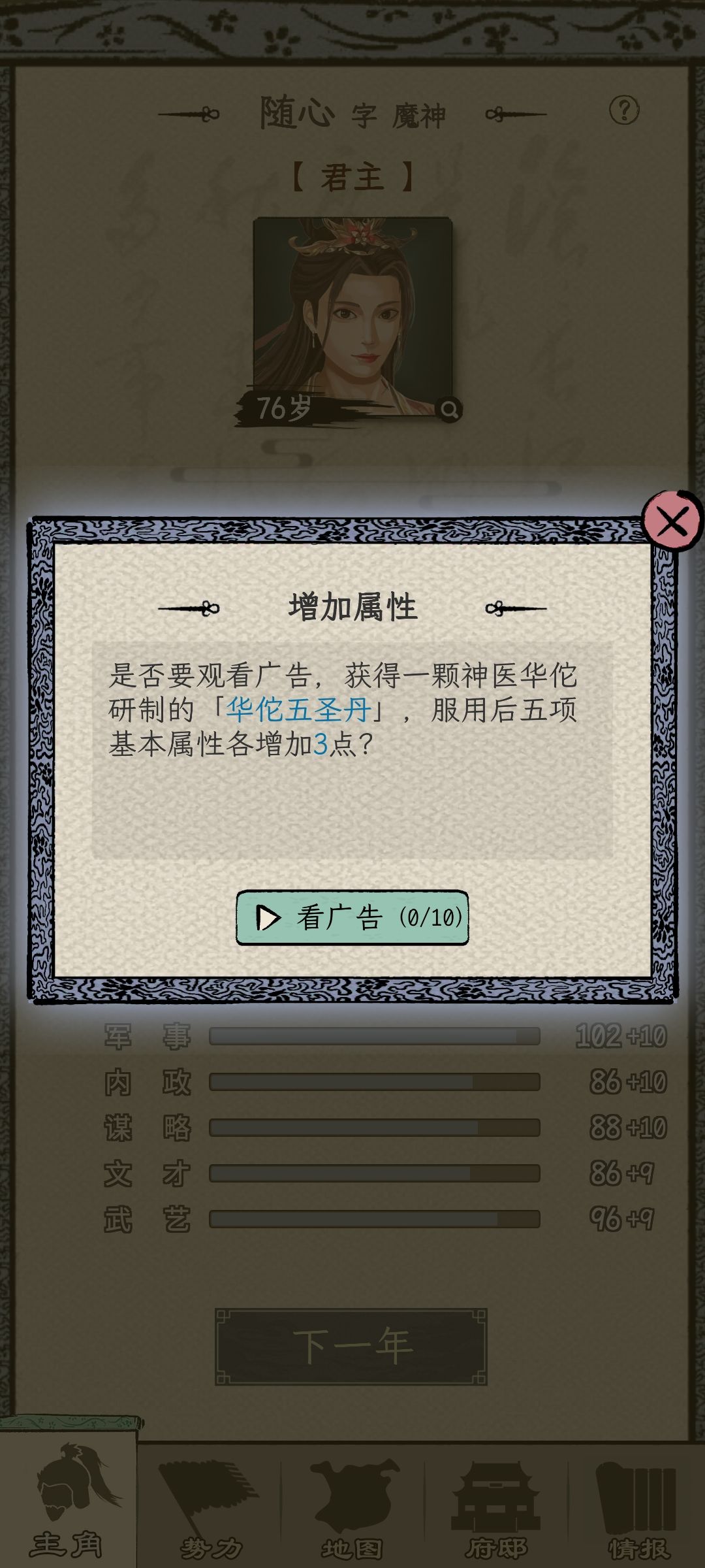 一个广告没看,前期尽量读书,贡献全满。26就能当太守。然后攻城略地,派你打下的城打。先打空的和武将少的,自己也打。等到1品的时候46岁,基本打完,只剩曹操和你。直接自立,后面看你心情,想早点打了就打,不想就满满玩(想46或者47结束游戏。就手动直接去打主城,因为1品之前已经打完所有城了,自立跑的人多,最后一个城100多个武将,自动打不会赢)