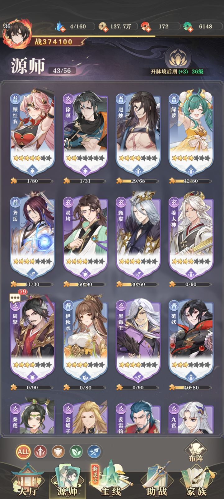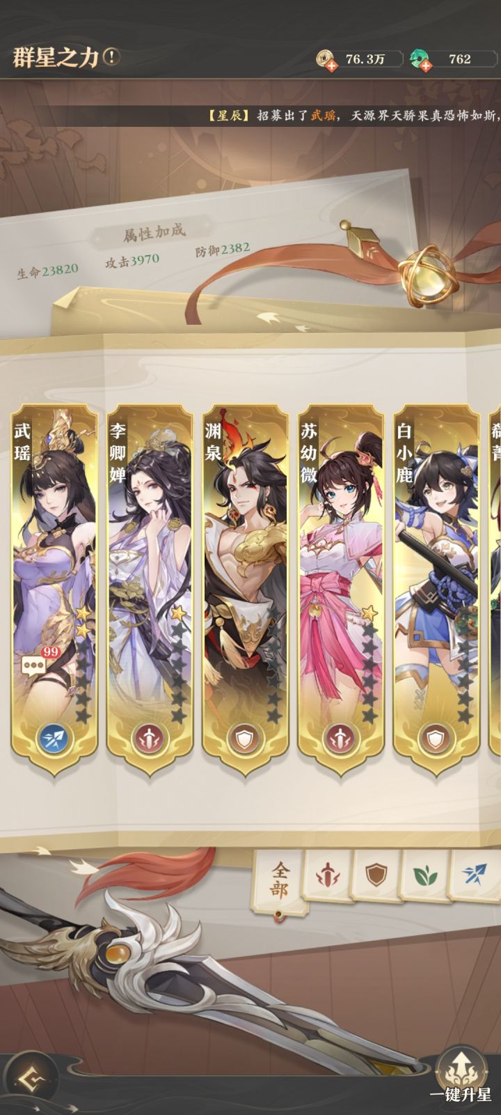 除了上阵的源师,其他源师有碎片可以升的,全都升了,别以为没用喔,因为升完之后,助战里面的群星之力和战功殿是可以提升战力的,还有包括庭院里面提升好感度也是➕战力的