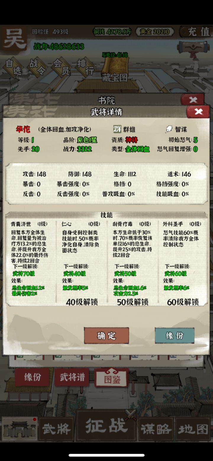 华佗优势:华佗和乐进增加友方最终伤害是一样的,区别是华佗有一个加血的技能,可以让黄忠不用带兰心,双墨攻增加输出。并且华佗公孙瓒吕布可以构成基础势力属性加成。