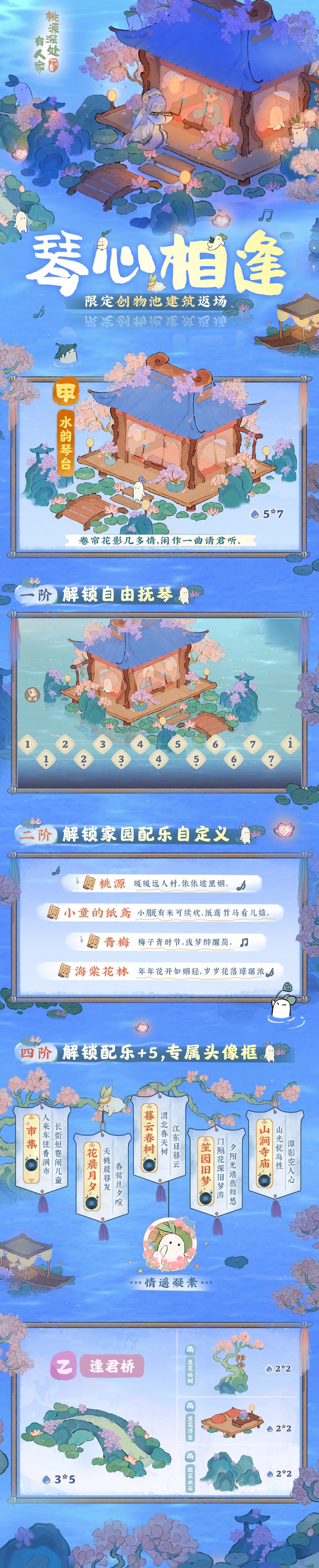 山民们可以在「琴心相逢」限时创物池中获得以上建筑,装扮自己的萝萝山哟!