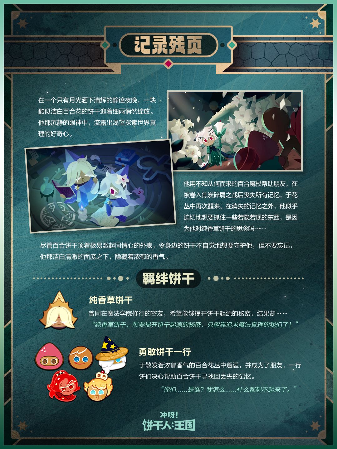在一个只有月光洒下清辉的静谧夜晚,一块酷似洁白百合花的饼干迎着细雨悄然绽放。他那沉静的眼神中,流露出渴望探索世界真理的好奇心……尽管百合饼干顶着极易激起同情心的外表,令身边的饼干不自觉地想要守护他,但不要忘记,他那洁白清澈的面庞之下,隐藏着浓郁的香气。