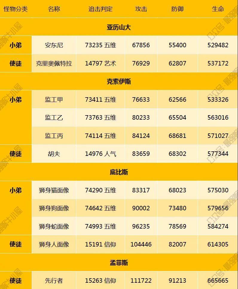要想解锁金字塔玩法,就必须先制霸金字塔使徒(属性拉胯的很,血量不到20万),之后就会开启金字塔玩法了。言归正传,下面列出现在时空各使徒及其小弟的属性。