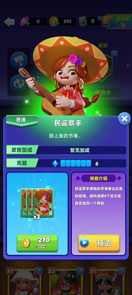 民谣歌手的技能充能为6,效果为随机将6个宝石转化为同一个颜色。民谣歌手的技能可以在盘面上增加6颗同色的宝石。如果使用技能转化出了技能所需的颜色宝石,民谣歌手是可以频繁开启技能的。