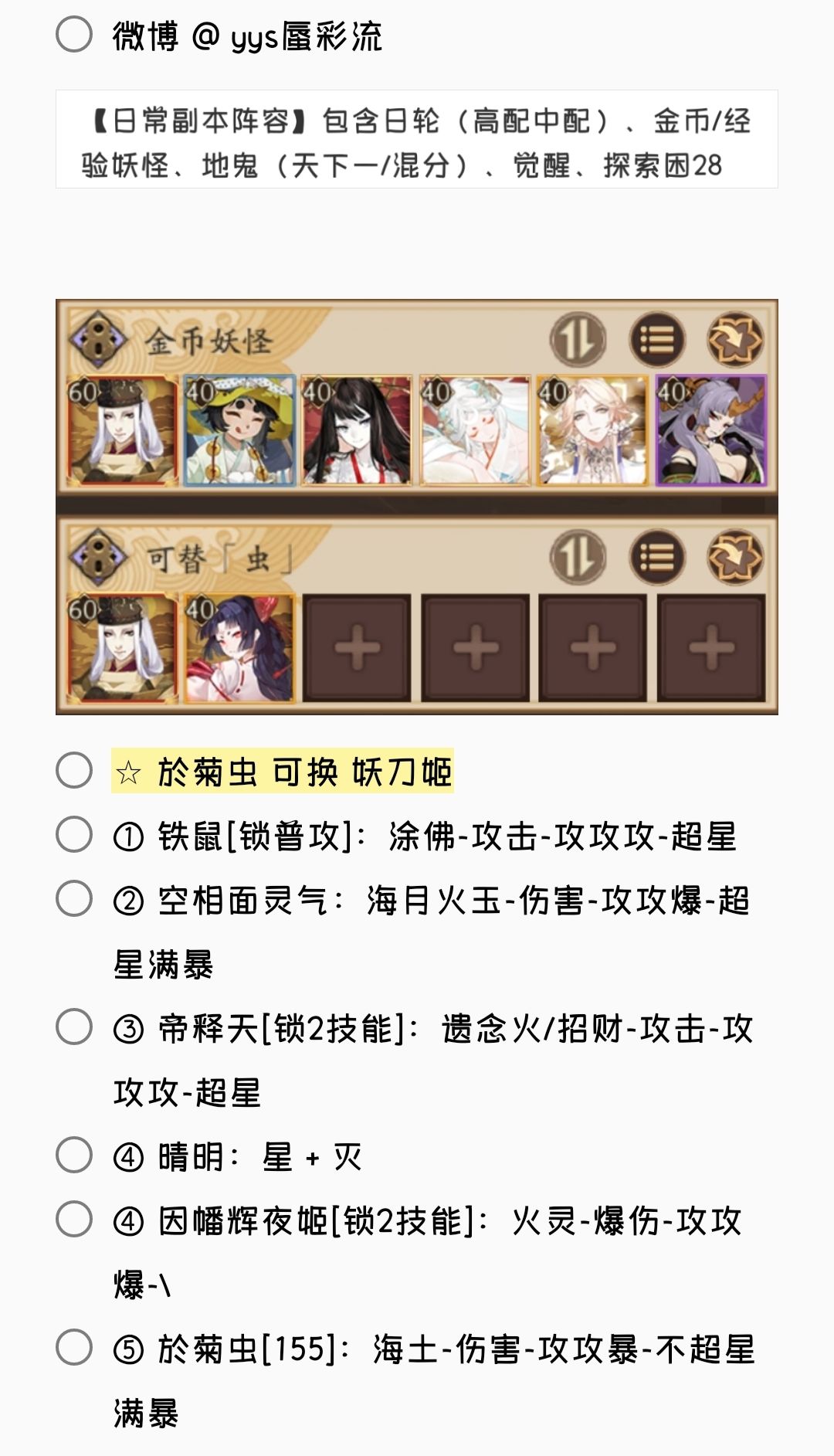 2. 若无特殊文字说明,阵容式神均需六星 + 满技能[151→至少满二技能,以此类推]