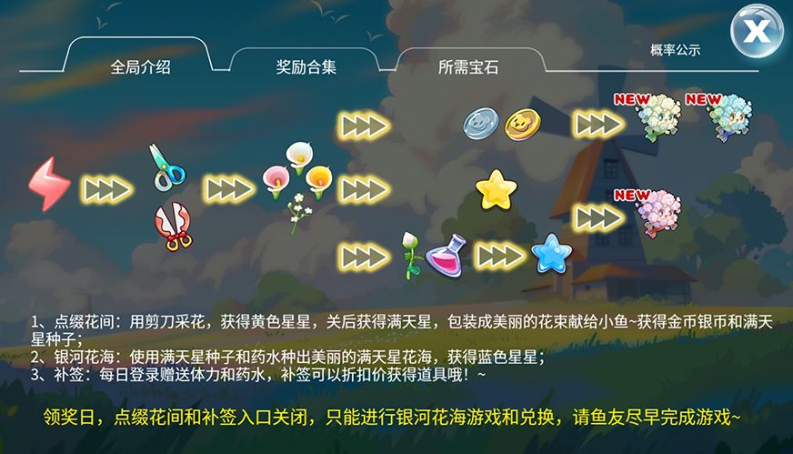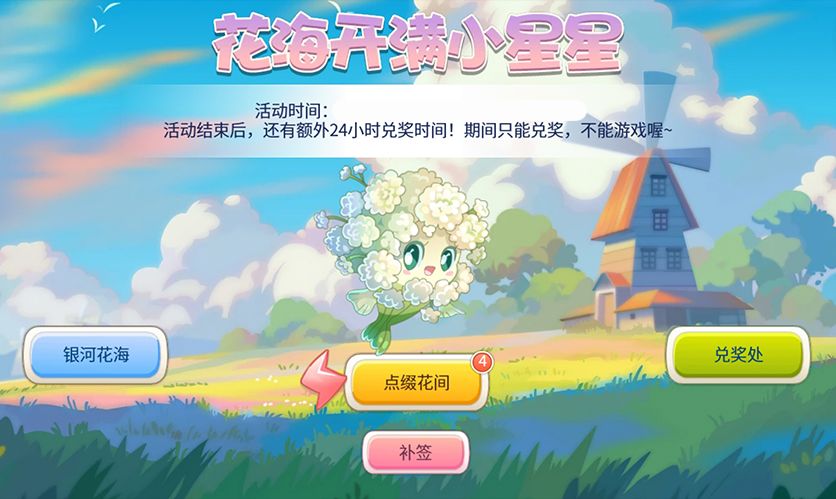 1、本活动分为四部分:点缀花间、银河花海、兑奖处,补签(体力、药水领取位置);