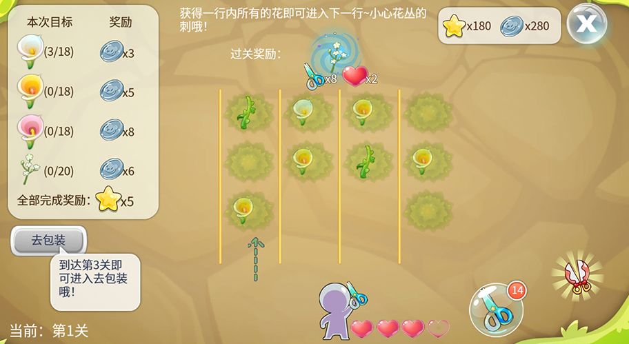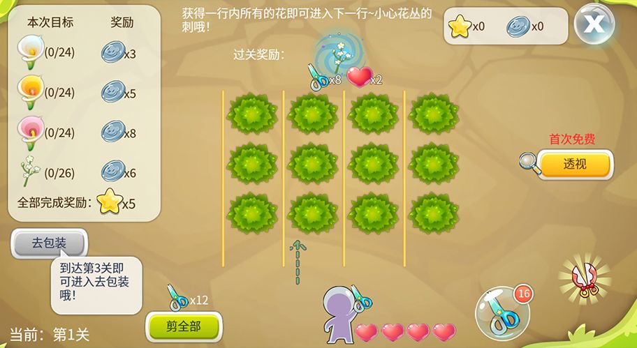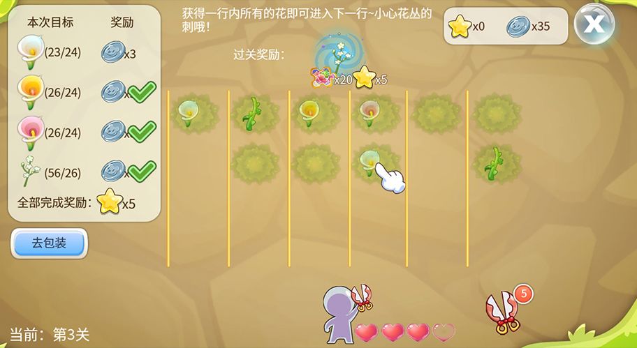 用剪刀采花,获得一行内所有的花之后可以进入下一行~