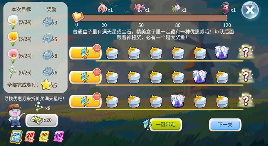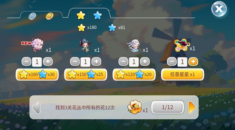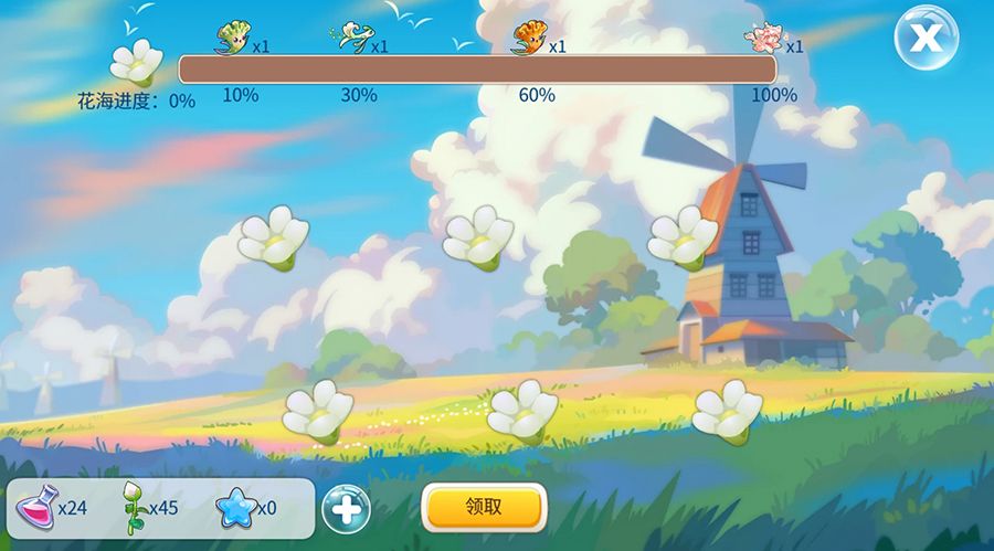 依次点击种子、药水,等待满天星开花后领取花花,收集蓝星星并累积花花进度,领取截图上方进度条福利~