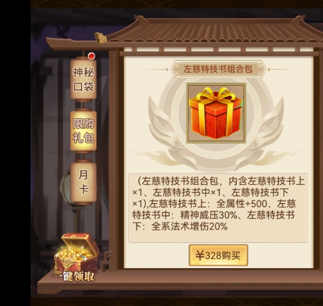 2.全屏追击。特别强力的技能,除了本体和分身各追击一次外,还拥有特殊的追击伤害算法,即无视敌军属性,纯粹以自身面板计算,可以打出成吨的恐怖输出。输出左慈的必氪特技。