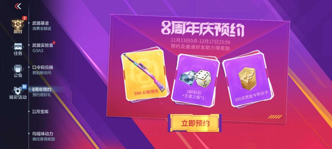 进入8周年庆预约小程序活动点击预约就可以领取100钻石+王者之骰*1+300点赏金令积分卡,还有一把98K-幻能朋克。