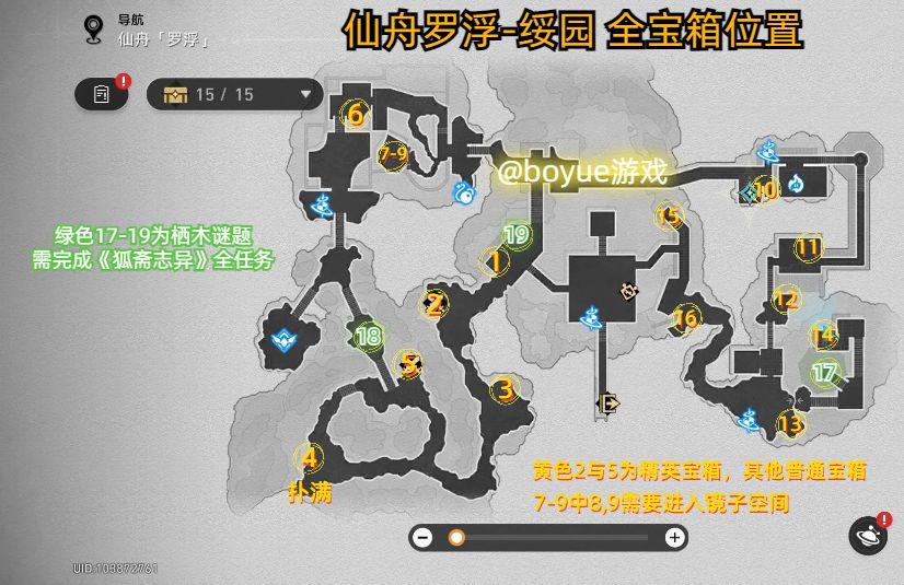 大家好,我是攻略小达人boyue,本篇来说下崩铁1.5版本仙舟罗浮-绥园的全宝箱攻略,共有19个宝箱加1个扑满;做完间章可获取前14个普通宝箱加2个精英怪宝箱,以及1个扑满;完成《狐斋志异》全任务可获得另外3个宝箱。
