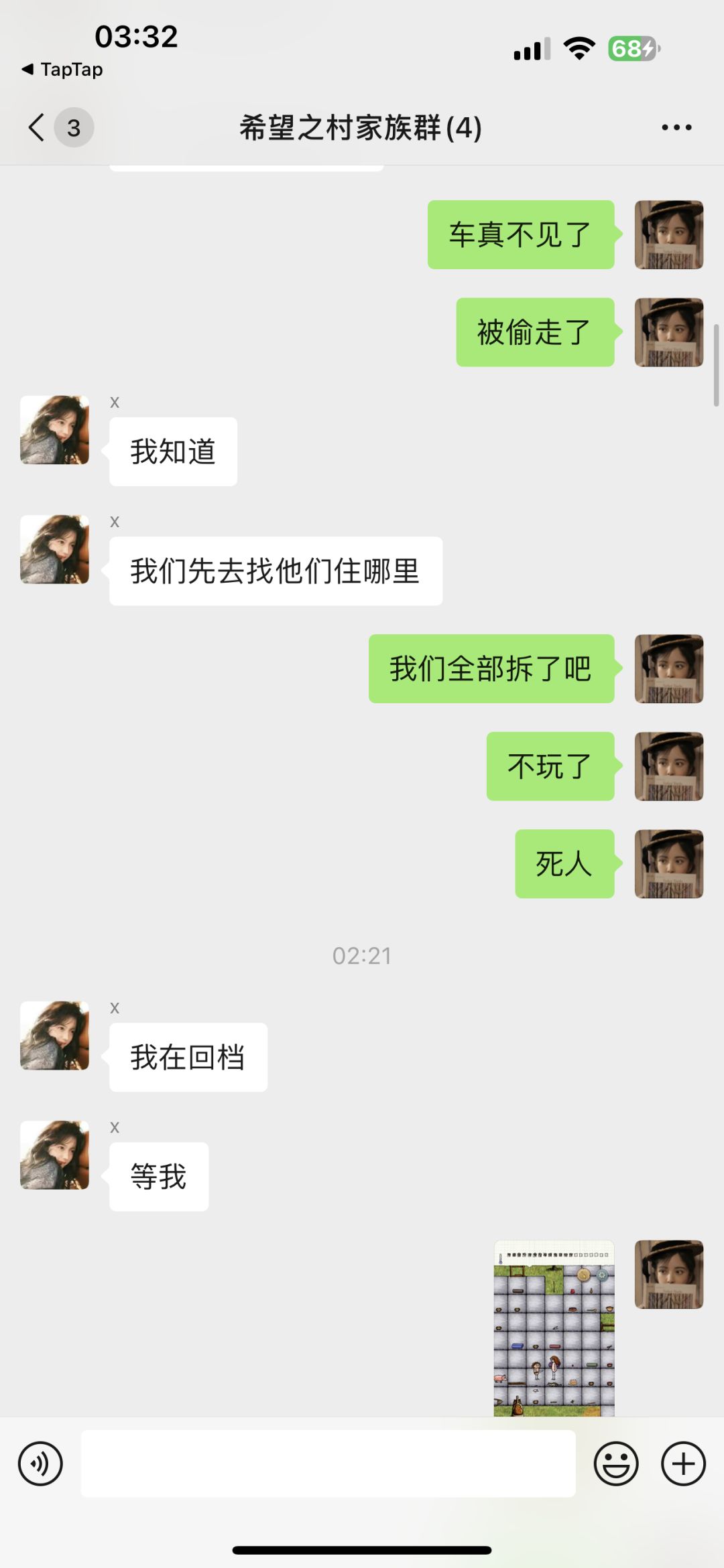前面出去找矿 一回家 看到一个女孩子 说饿 来吃点东西 我就好心收留了她 然后一看 家里种的百合被用了 心里隐隐不安 果然 刚上线 家里全部都是陌生人 被她的孩子追着骂 说我才是小偷 还拿刀来捅我 什么时候能有一些有素质的人