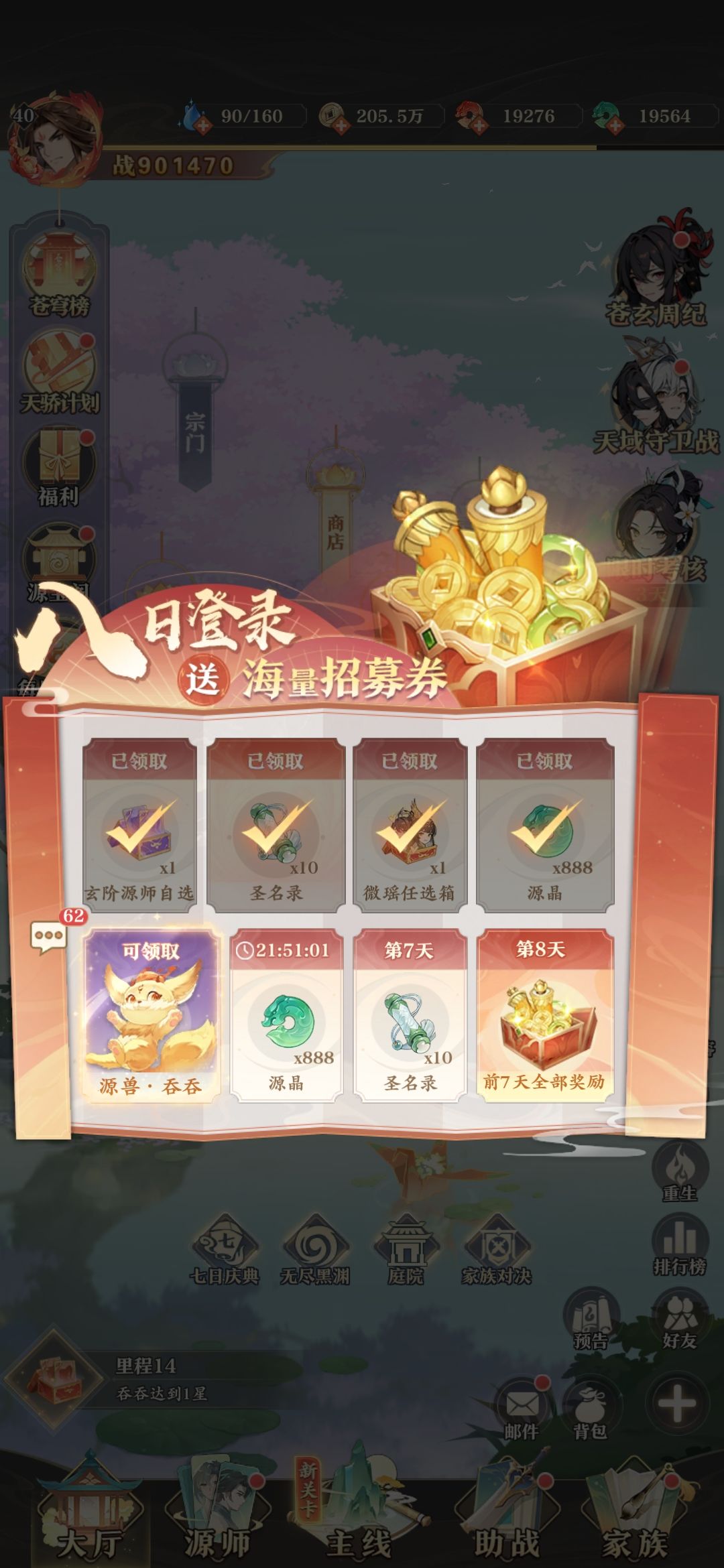 3、推图至第十三章结束,竞技场37名,天域守卫战25名,无尽黑渊485层