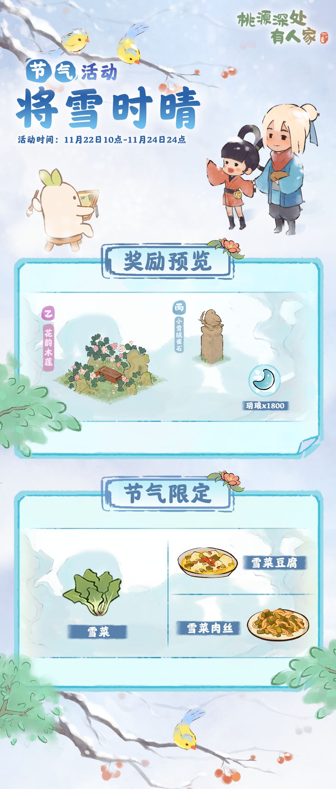 山民在活动期间内,可种植特殊农作物「雪菜」和制作特殊节气菜肴「雪菜豆腐」「雪菜肉丝」,提交节气订单可以额外获得玥琅。萝萝山已准备好了本期的节气限定建筑,山民记得参与活动获取玥琅,不要错过兑换时间萝