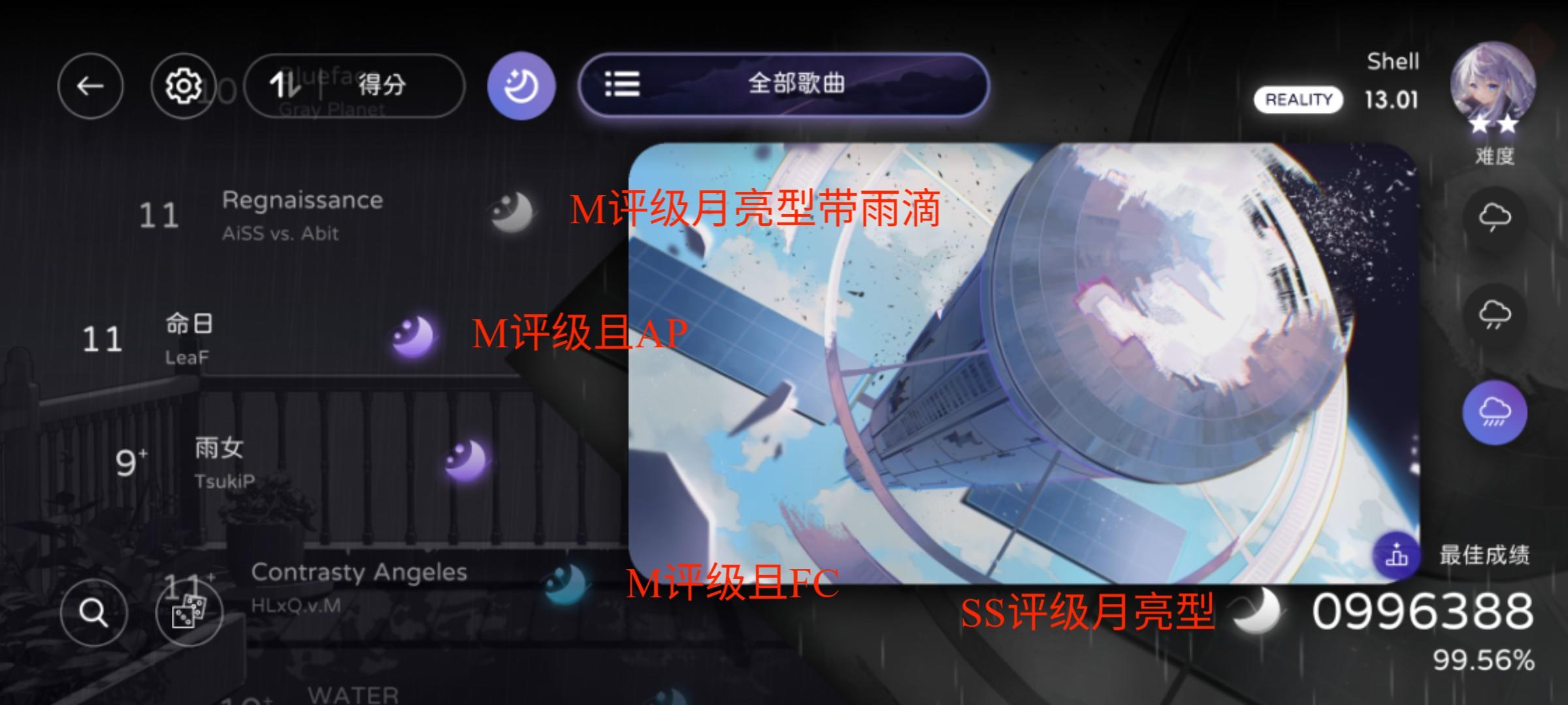 结算评级可分为十种,其中三种额外评级在歌曲游玩结束时以颜色方式呈现: