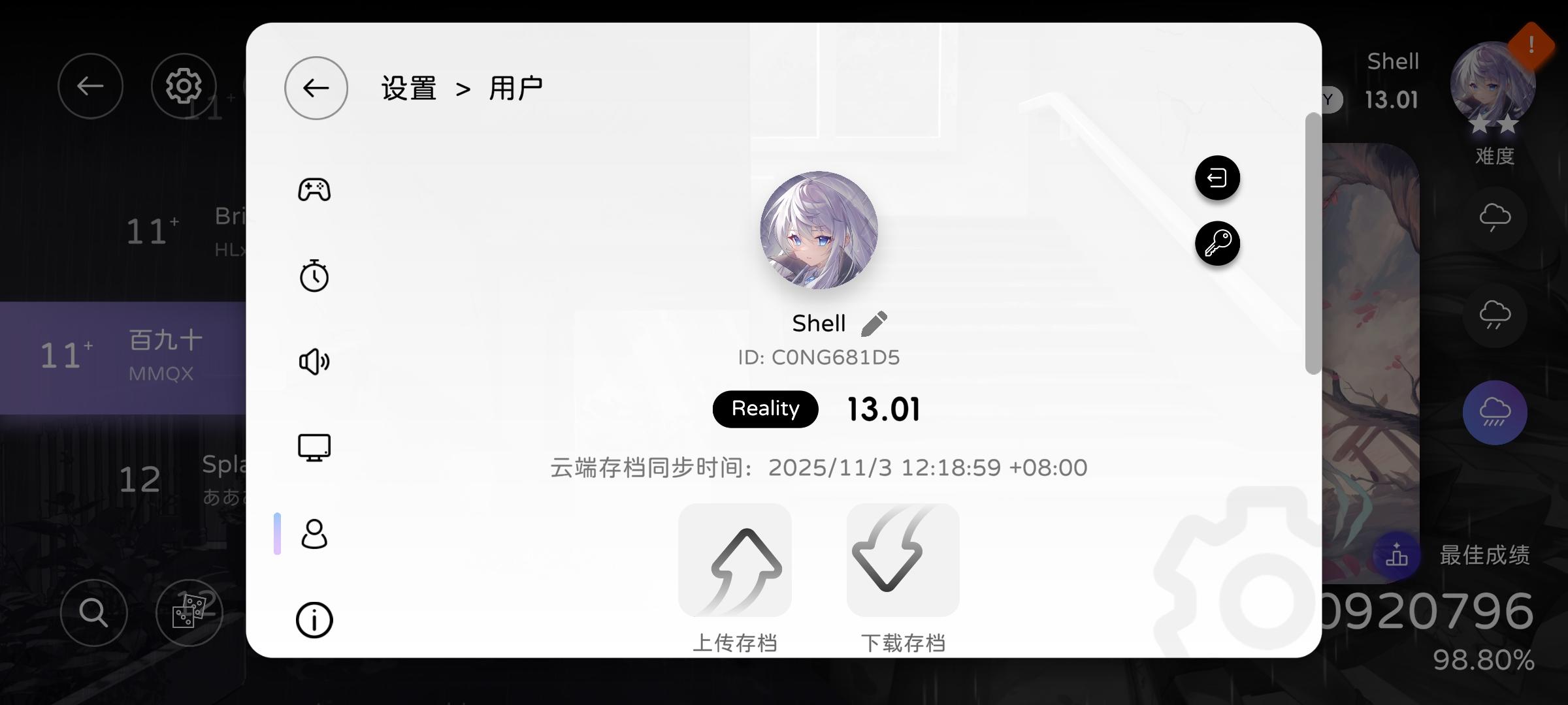 右上角显示玩家的名称,REALITY数值和星星数量,下面是难度和成绩以及完成百分比。上下拖动左边的曲目栏,在右边选择难度,点击曲绘即可开始游戏。