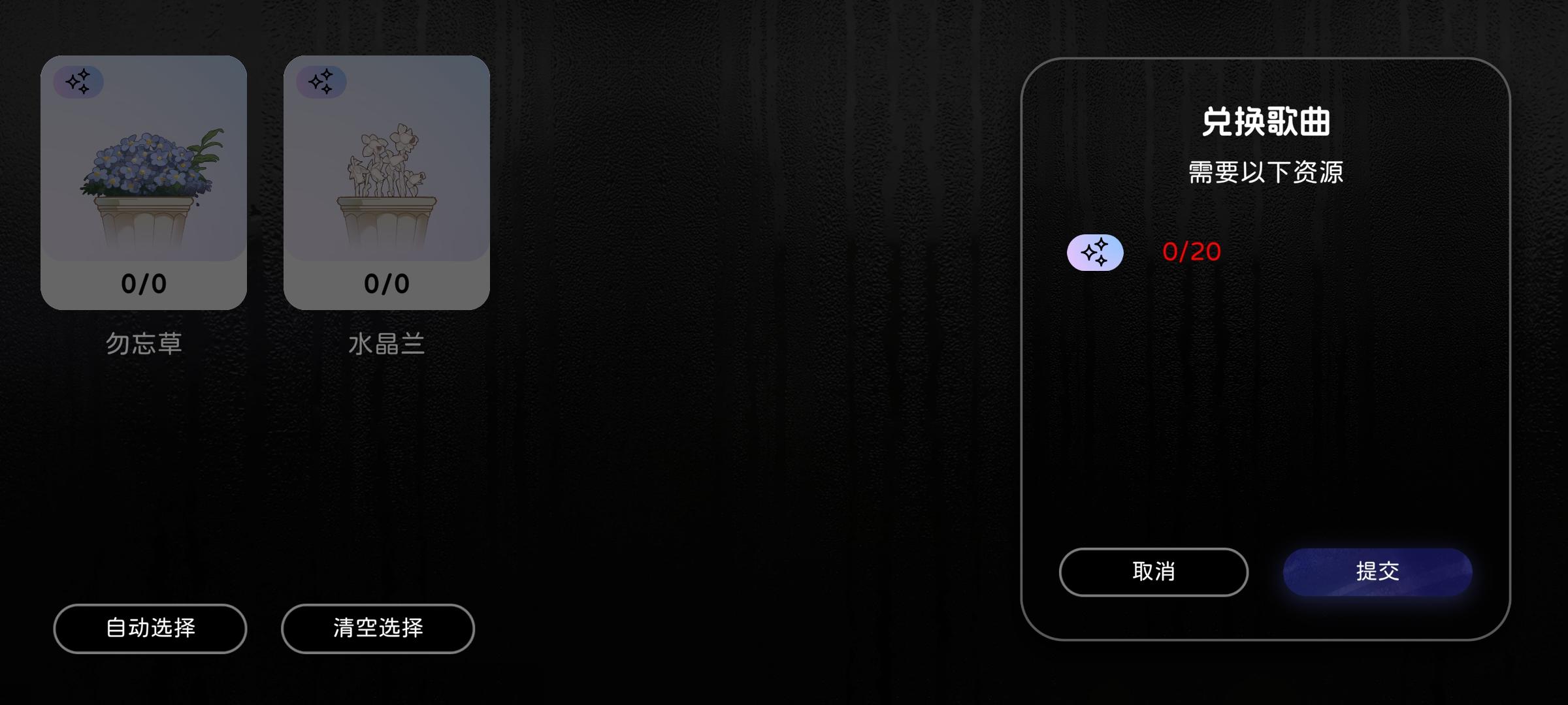 部分乐曲为露晓卉庭专属曲目,你可以在章节选择里找到露晓卉庭,然后点击带有花卉图案的乐曲。使用作物作为货币进行解锁,不同乐曲需要的植物种类和数量不同。