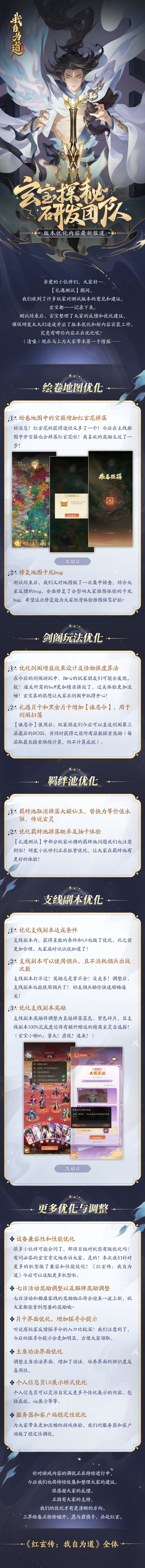 在「礼遇测试」期间,小伙伴们的所有反馈我们都已查收,并在第一时间发送给了研发大大们。那么接下来,红玄三界会有哪些改动呢?一张图带你速览重点优化内容——