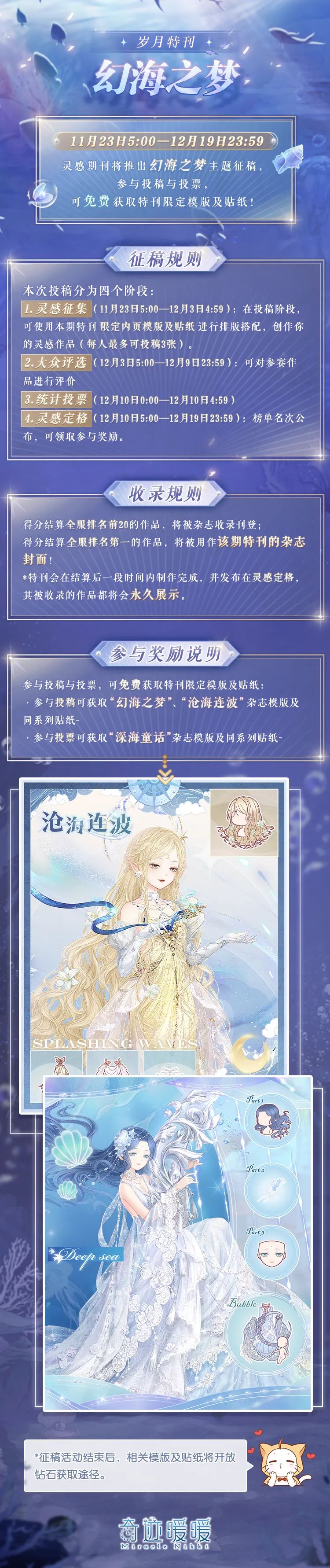 11月23日5:00—12月19日23:59,前往“灵感空间-岁月特别企划”,可参与岁月幻海主题特刊“幻海之梦”杂志投稿。参与投稿与投票,可免费获取特刊限定模版及贴纸!