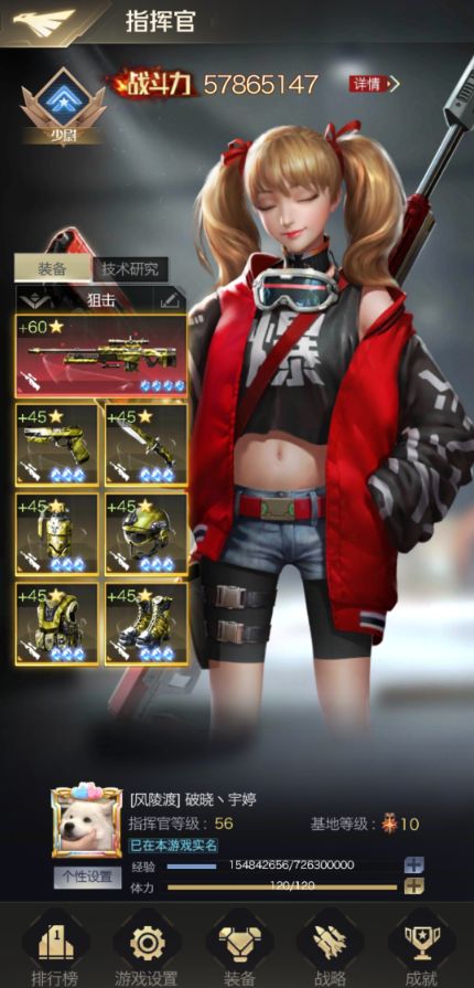 目前,“是宇婷呀丶”基地10星,指挥官等级56,主玩狙击,拥有6500万战力,在110人的【听风念故人】联盟担任先锋位置。她只有一个游戏理念——“无兄弟,不红警!”