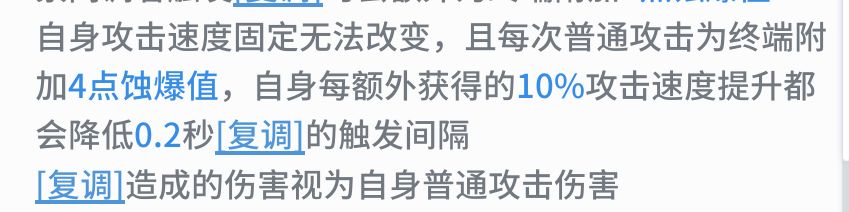自带二连击和穿透,假如复调有间隔,那么仅对首个目标触发且只有一次,但是没有间隔以后复调就能覆盖每个普攻命中的目标,且单目标也能出2次复调,就算撇开复调的伤害不谈,光复调给的蚀爆值就是赚的。所以给云99%和100%攻速是两个世界。