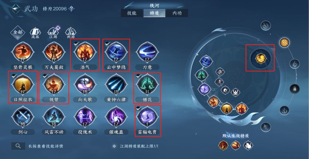 铁河特质搭配:大特质:铁衣的。小特质:云中梦隐,惜花,浩气,雷辎电胄,日照征衣,铁臂。