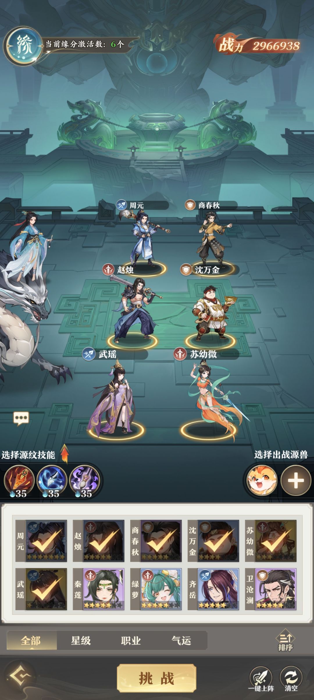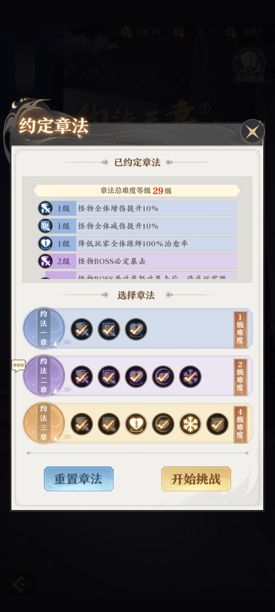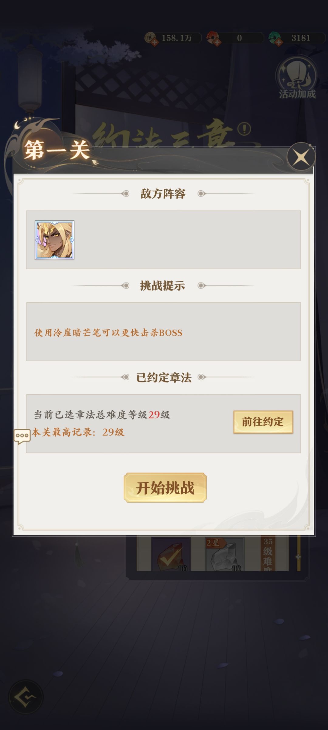 一、第一关选的29级挑战约定章法如下图